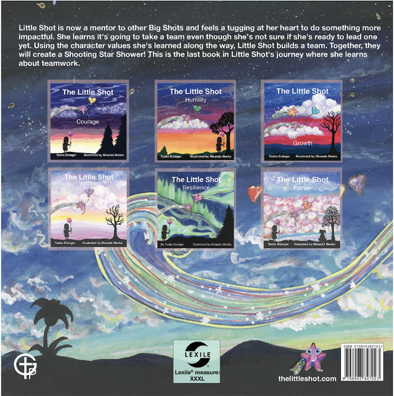Little Shot is now a mentor to other Big Shots and feels a tugging at her heart to do something more impactful. She learns it’s going to take a team even though she’s not sure if she’s ready to lead one yet. Using the character values she’s learned along the way, Little Shot builds a team. Together, they will create a Shooting Star Shower! This is the last book in Little Shot’s journey where she learns about teamwork.